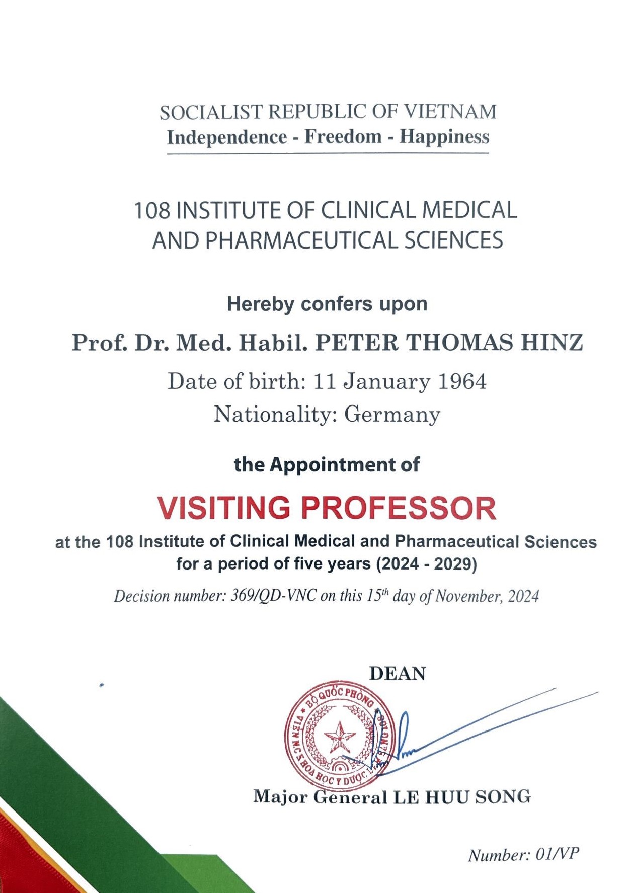 Am 19.11.2024 war die feierliche Übergabe der Gastprofessur an Prof. Dr. Peter Hinz im berühmten Militärkrankenhaus 108 in Hanoi, der Hauptstadt von Vietnam. Erstmalig erfuhr diese Ehre ein ausländischer Akademiker.