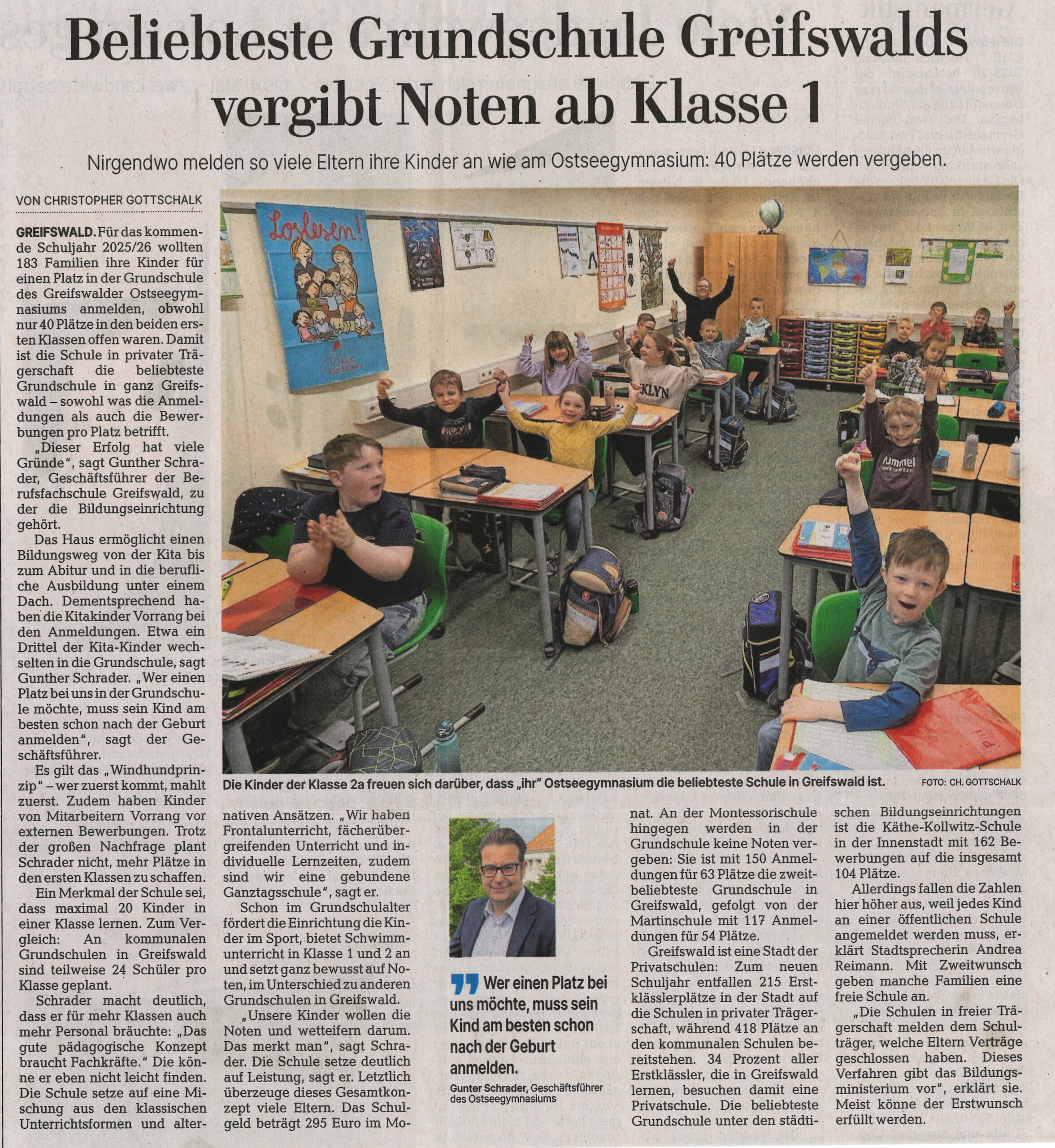 Für das kommende Schuljahr 2025/26 wollten 183 Familien ihre Kinder für einen Platz in der Grundschule des Greifswalder Ostseegymnasiums anmelden, obwohl nur 40 Plätze in den beiden ersten Klassen offen waren. Laut einer Umfrage der Ostsee-Zeitung ist die Schule in privater Trägerschaft die beliebteste Grundschule in ganz Greifswald – sowohl was die Anmeldungen als auch die Bewerbungen pro Platz betrifft.