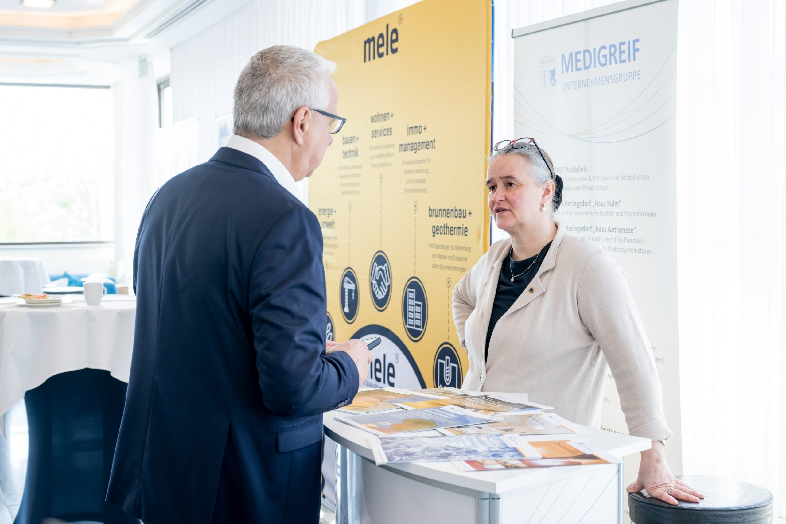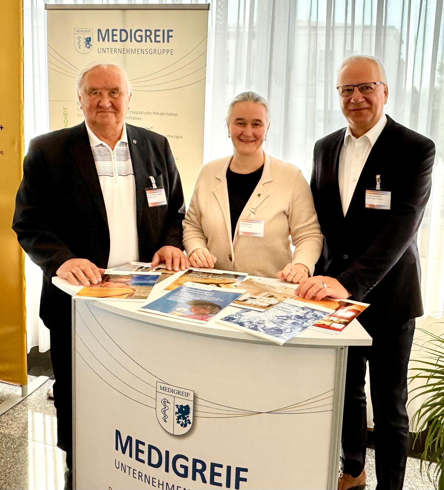 Zum ersten Mal kam auch unser neuer Messestand zum Einsatz und bewährte sich ausgezeichnet. Unser tolles Haustechnikerteam vom Inselklinikum hat alles professionell transportiert und aufgebaut. Alles hat super geklappt. Höhepunkte waren einerseits der gemeinsame Gedankenaustausch zwischen Professor Dr. Dietmar Enderlein, Frau Katja Enderlein und Dr. Stefan Rudolph mit der Präsidentin der Deutschen Rentenversicherung Bund, Frau Gundula Roßbach. Nicht nur, dass man sich sofort menschlich gut verstand, auch die Übereinstimmung in der Bewertung der vor uns liegenden Herausforderungen hat gutgetan.