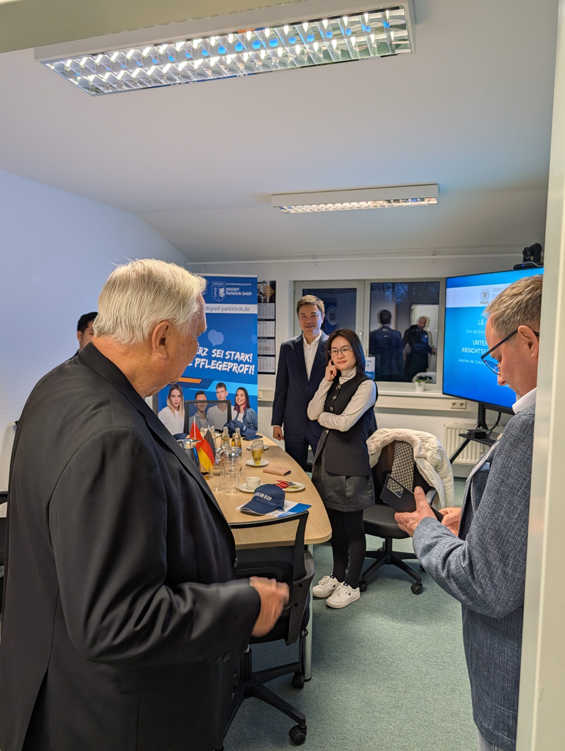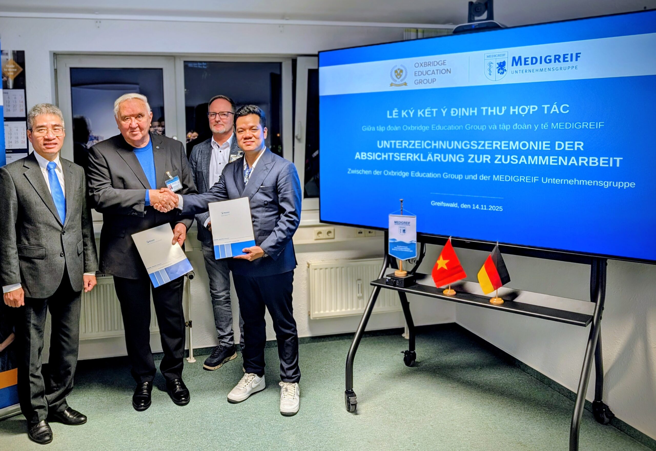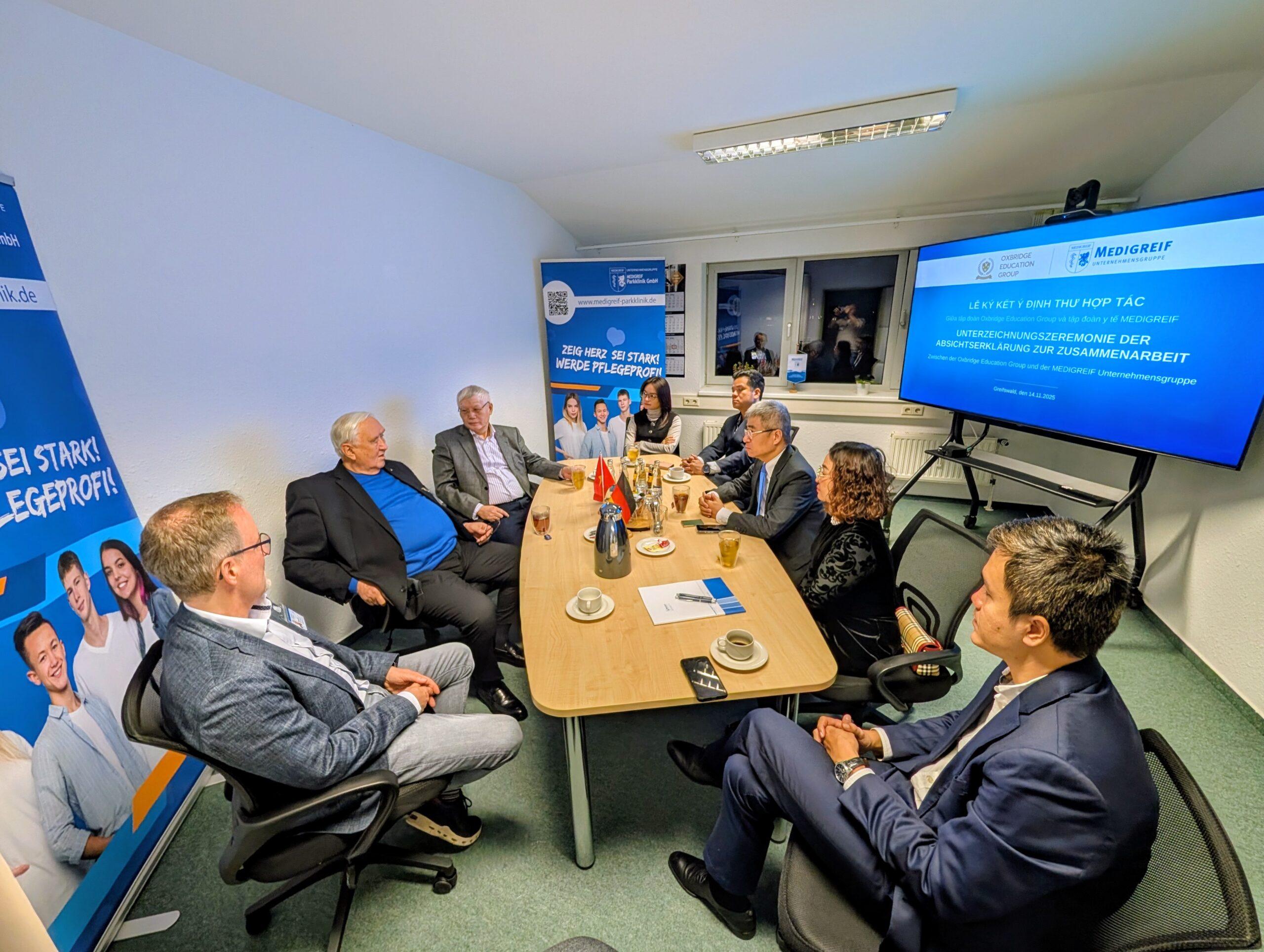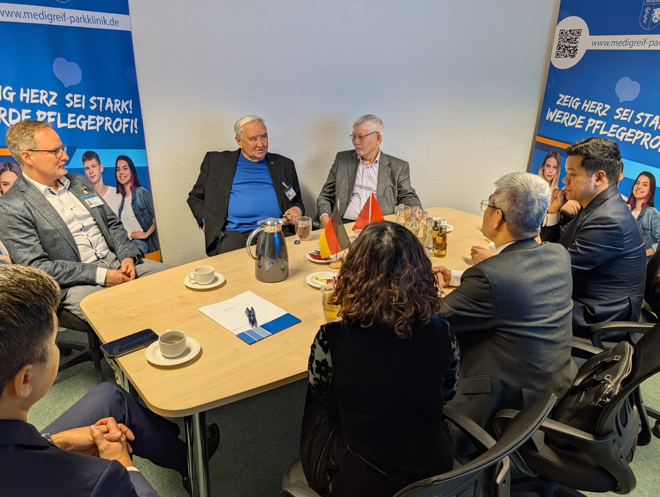 Am 14.11.2025 begrüßte Prof. Dr. Dietmar Enderlein auf dem Greifswalder Gelände der MEDIGREIF Unternehmensgruppe den Botschafter der Sozialistischen Republik Vietnam, H.E. Nguyen Dac Thanh und Vertreter der Oxbridge Education Group, zu einem konstruktiven Dialog über nachhaltige Zusammenarbeit im Bereich Ausbildung und Fachkräfteentwicklung. Im Mittelpunkt des Treffens stand die Unterzeichnungszeremonie einer Absichtserklärung, die die Zusammenarbeit beim Aufbau und Betrieb einer vietnamesisch-deutschen bilingualen Schule in Hanoi (Vietnam) beschreibt.