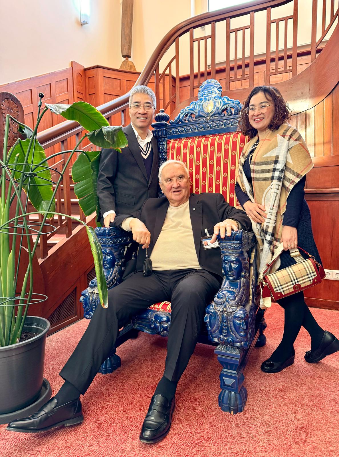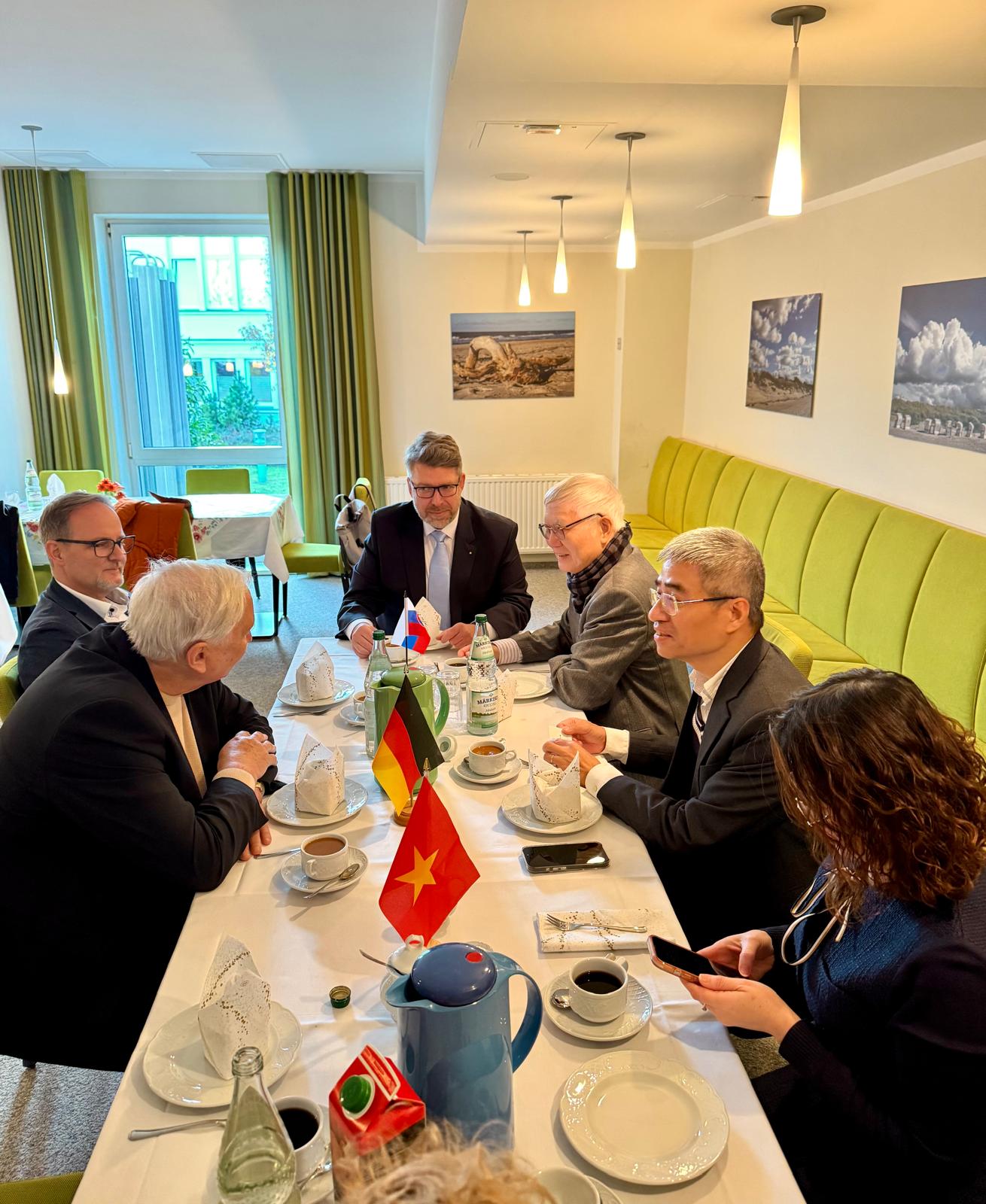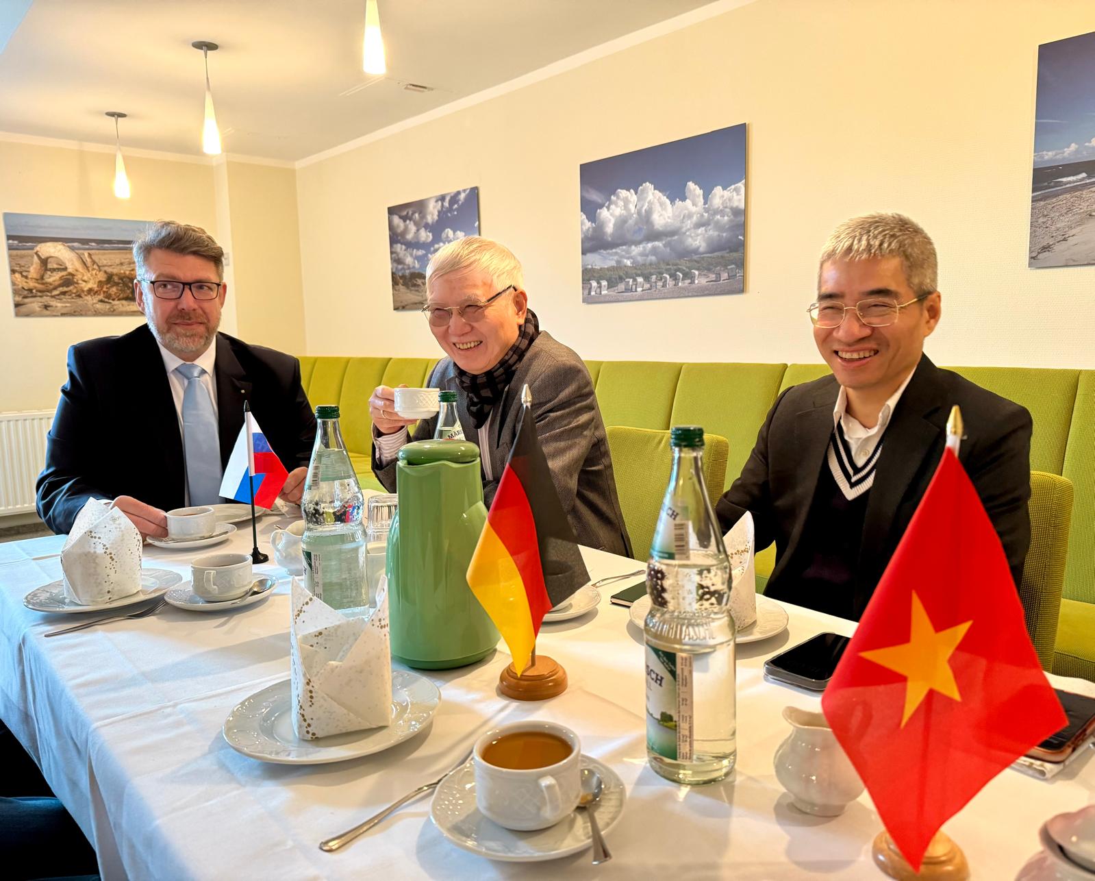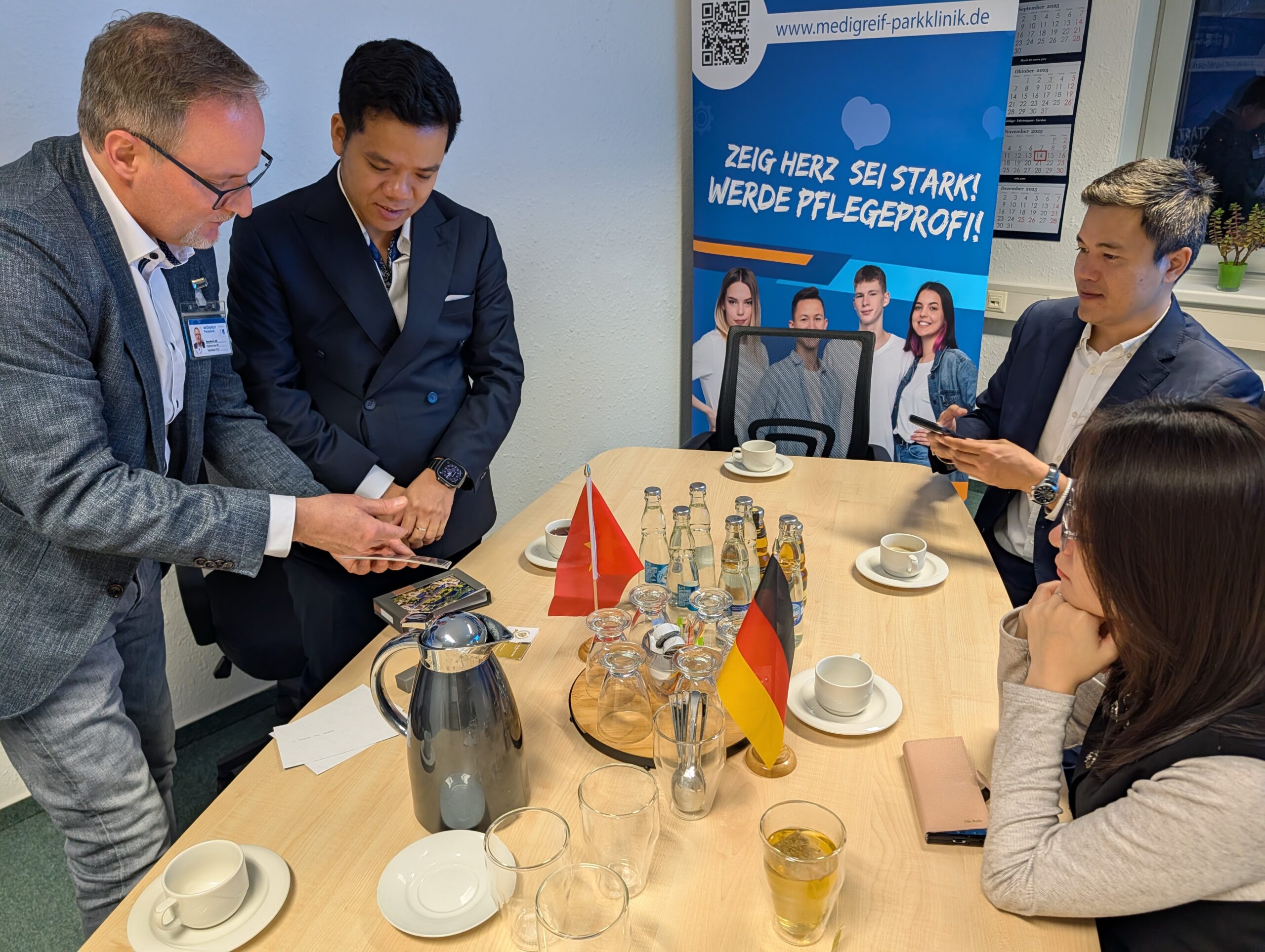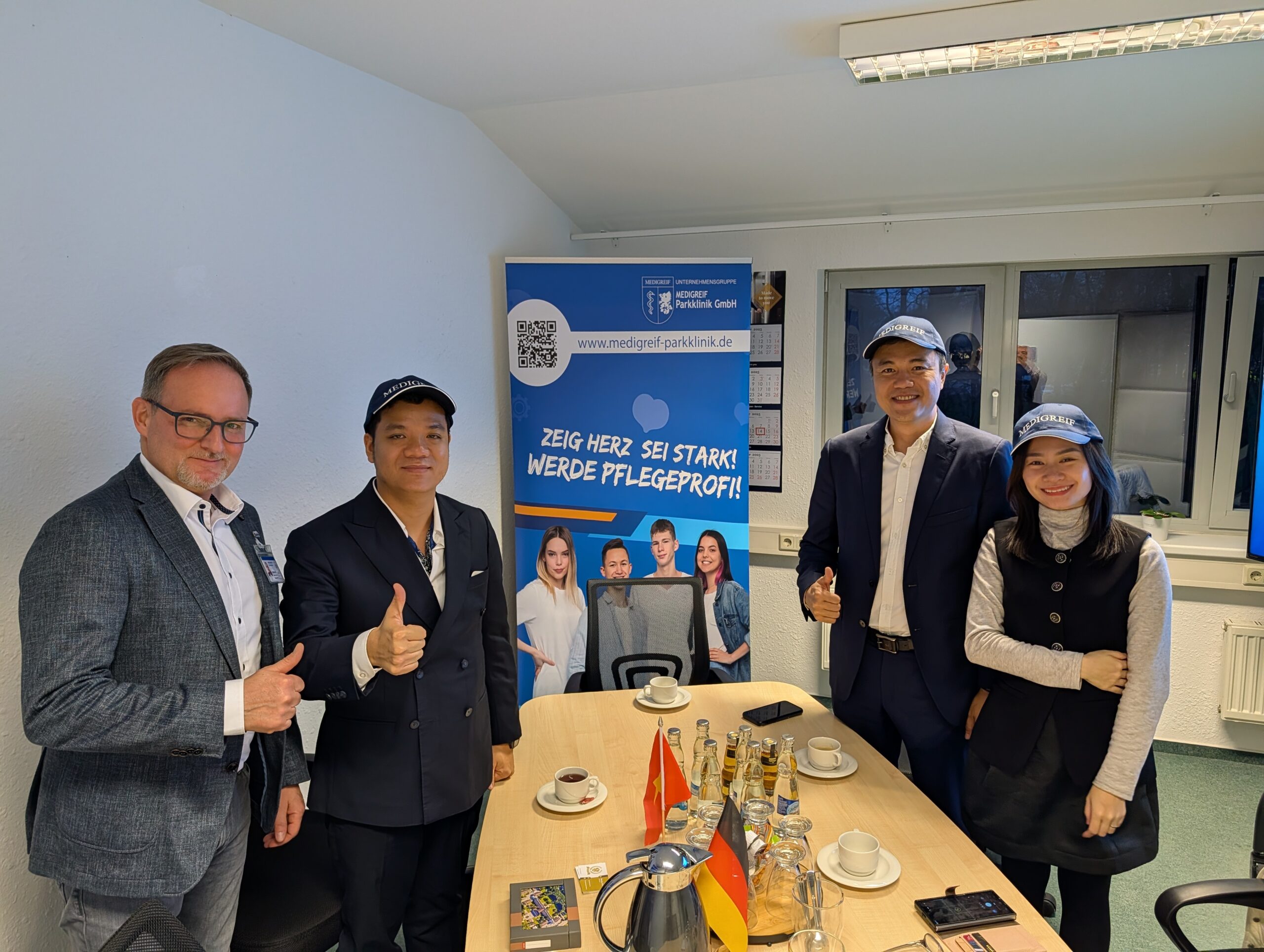 Am 14.11.2025 begrüßte Prof. Dr. Dietmar Enderlein auf dem Greifswalder Gelände der MEDIGREIF Unternehmensgruppe den Botschafter der Sozialistischen Republik Vietnam, H.E. Nguyen Dac Thanh und Vertreter der Oxbridge Education Group, zu einem konstruktiven Dialog über nachhaltige Zusammenarbeit im Bereich Ausbildung und Fachkräfteentwicklung. Im Mittelpunkt des Treffens stand die Unterzeichnungszeremonie einer Absichtserklärung, die die Zusammenarbeit beim Aufbau und Betrieb einer vietnamesisch-deutschen bilingualen Schule in Hanoi (Vietnam) beschreibt.