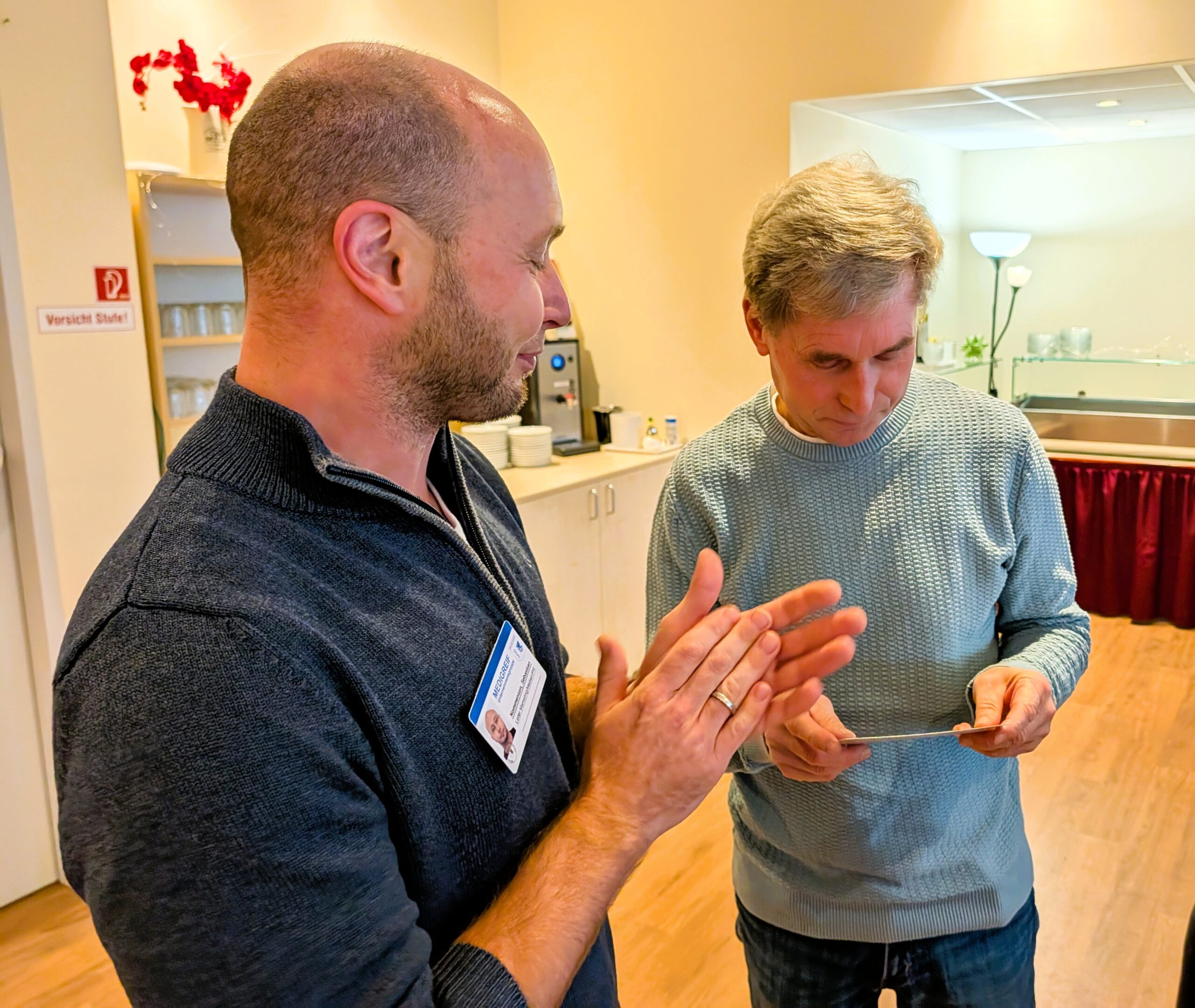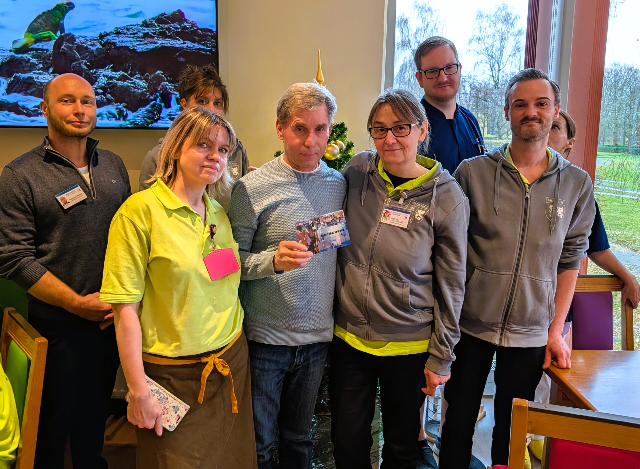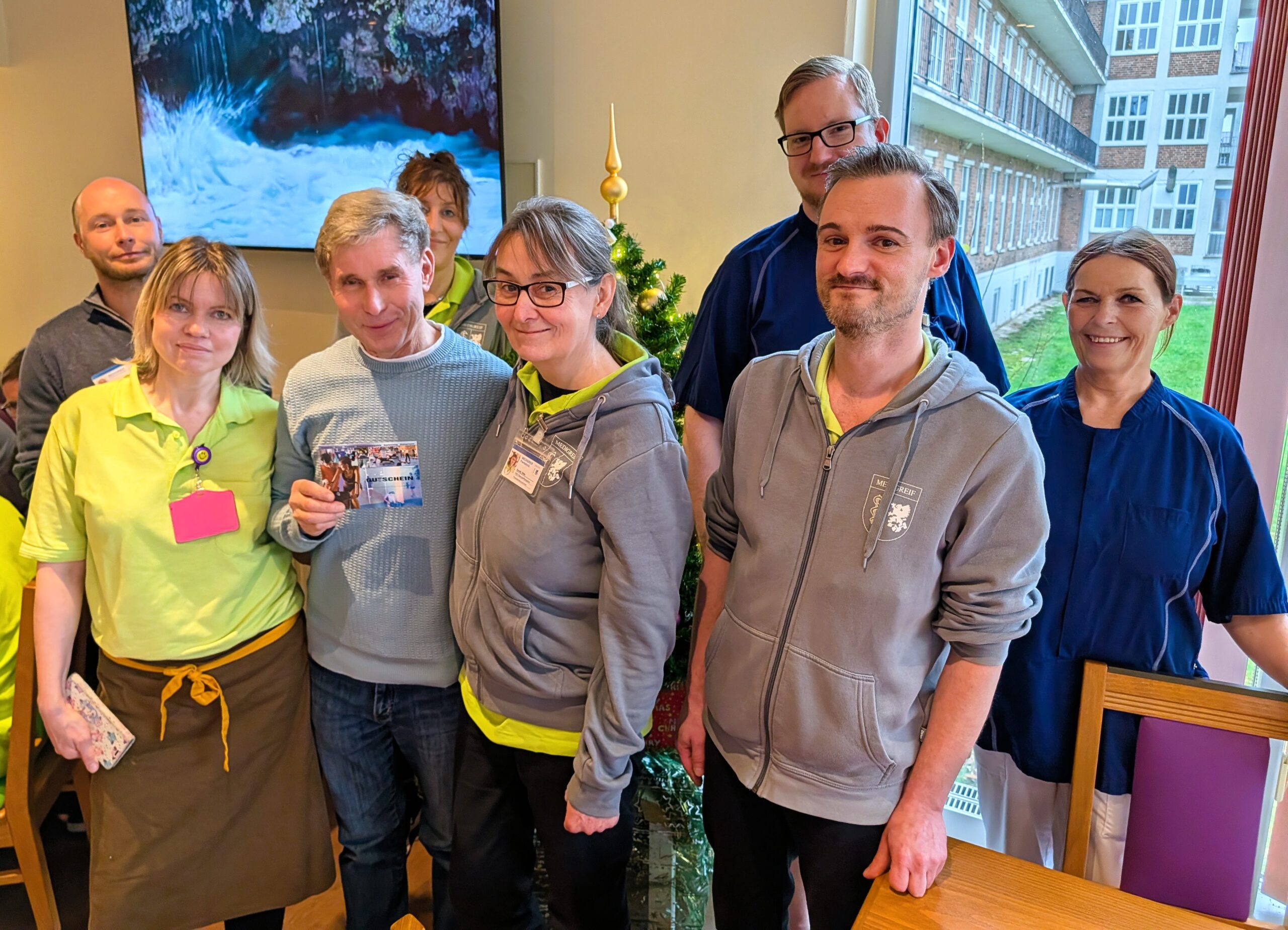 Marketingleiter Sebastian Nommensen überreichte ihm feierlich den Gutschein – eine Tageskarte für das SINUS, inklusive Sauna, Fitnesstraining sowie Sport- und Tanzkursen. Frank ist langjähriger Mitarbeiter in der Patientenversorgung der Orthopädie der Parkklinik gewesen. Beziehungsweise ist er es noch: Trotz wohlverdienten Ruhestands, arbeitet er noch auf Zuverdienst im Service.